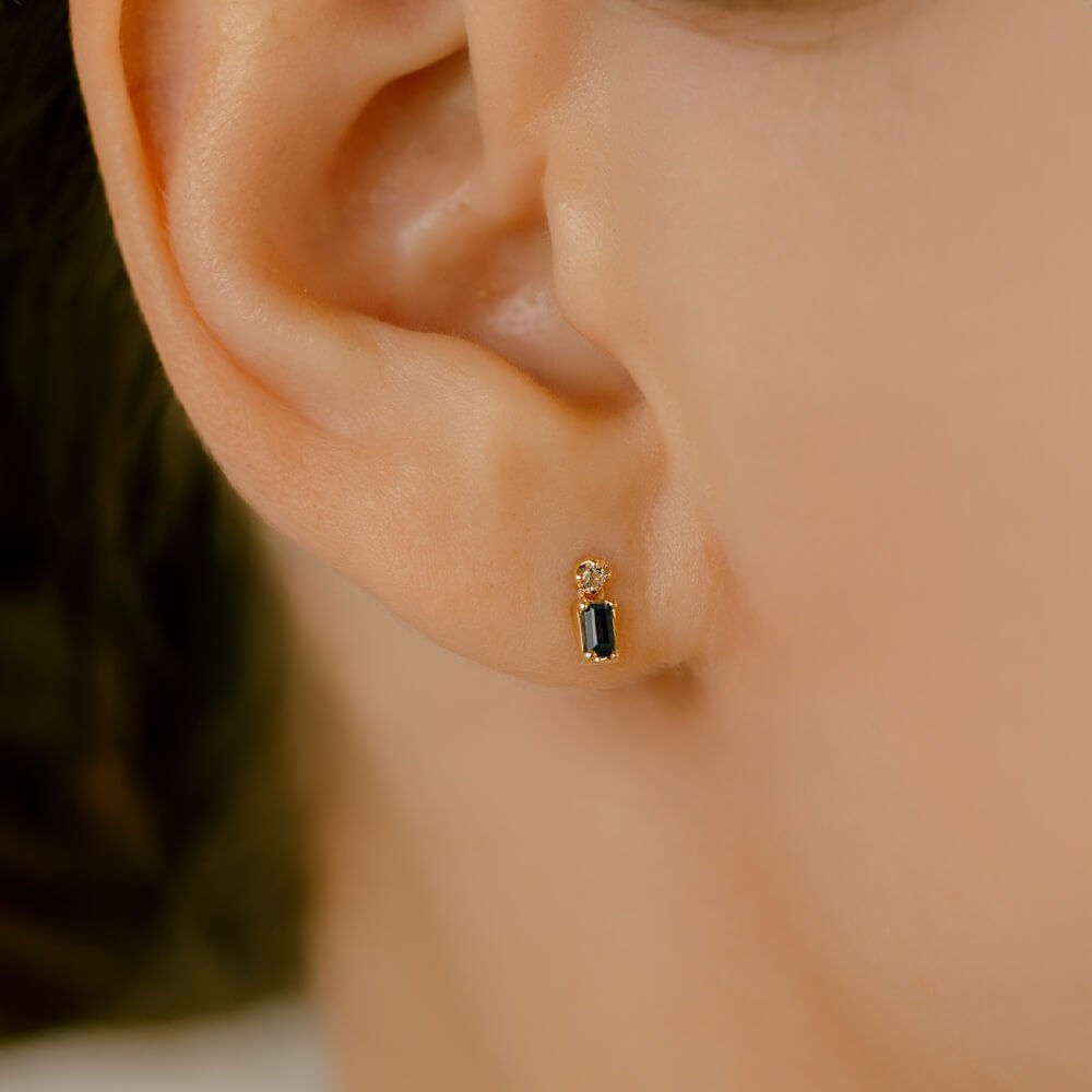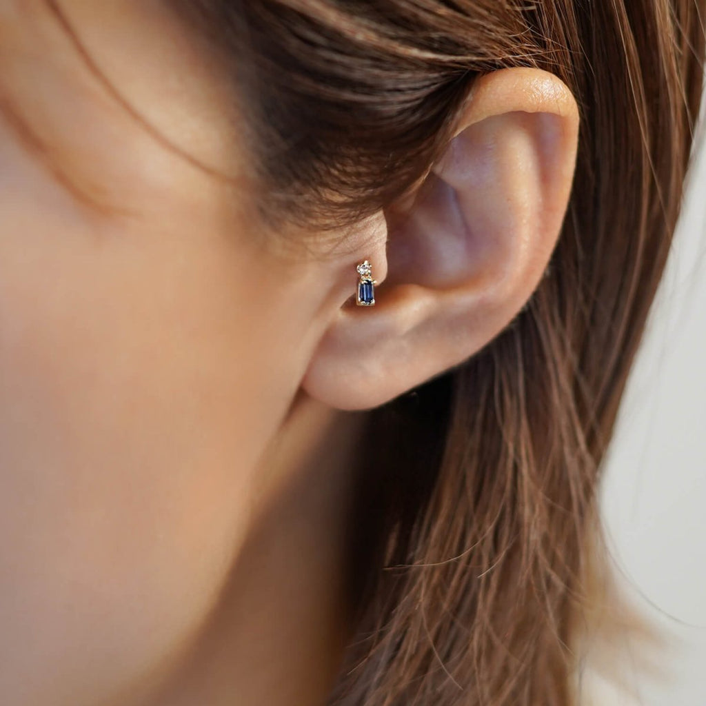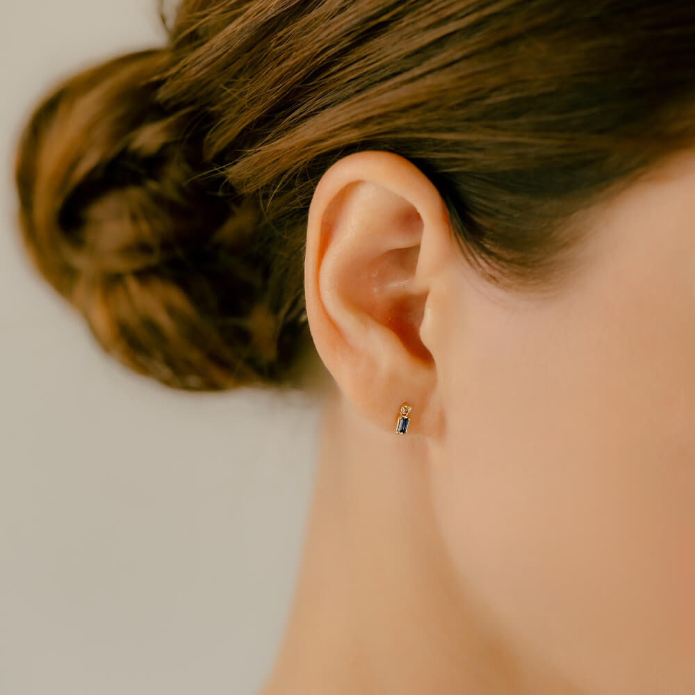 さりげなく揺れる深いブルーとゴールドの輝き。スクエアカットのサファイアが上品で知的な印象を与えるオトナのアイテム。