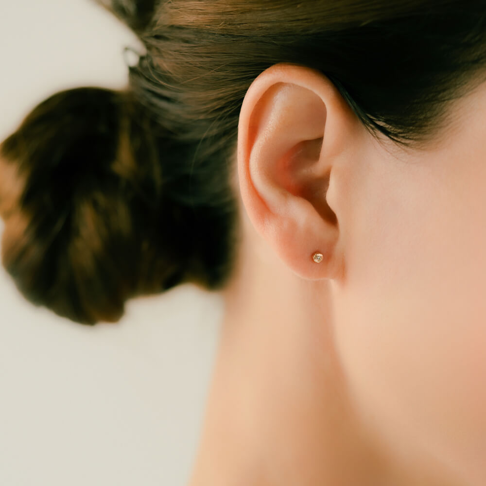 Small and charming in size. A bezel setting that won’t catch on things and is fine to wear all the time. Natural-textured gold with a sparkling champagne-colored diamond gives it a slightly understated, grown-up vibe.