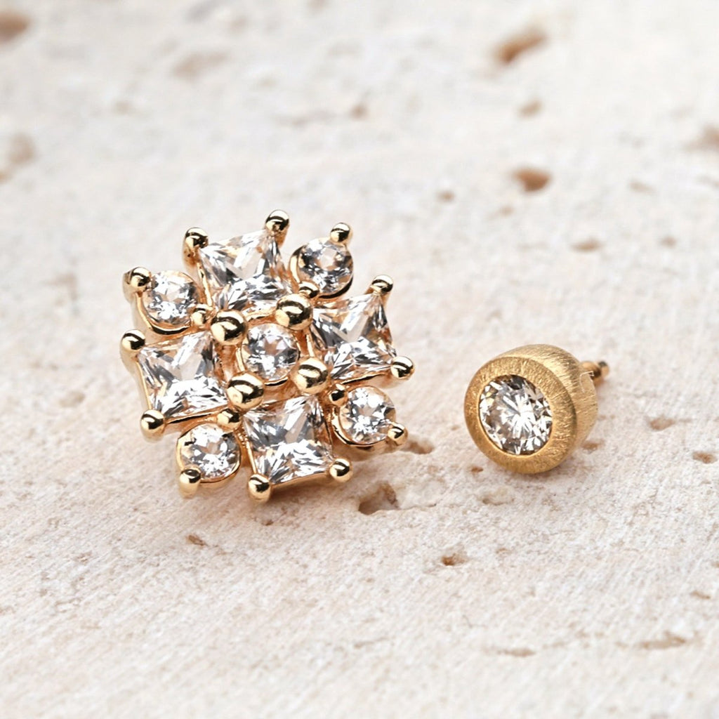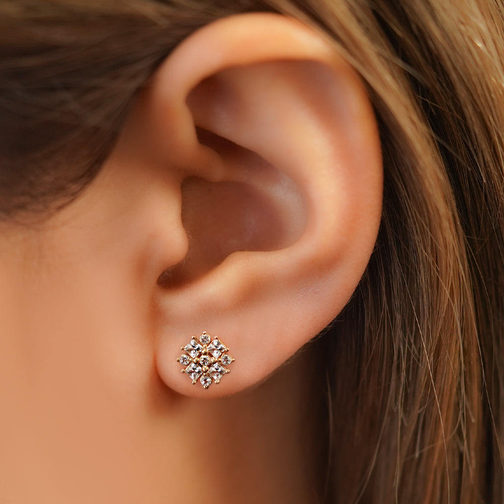 スクエアカットとラウンドカット。輝きの変化がエレガントな存在感を放つちょっと大き目モチーフ。さりげなく耳裏をおしゃれに飾るのにもおすすめです。