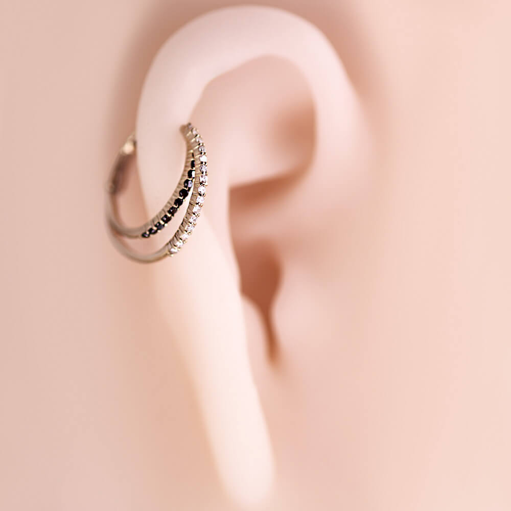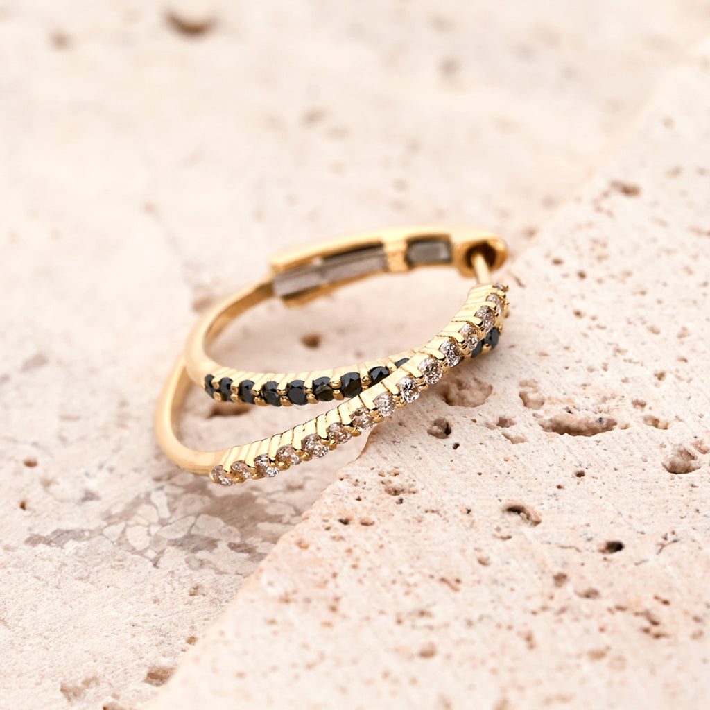 ブラックダイヤモンドとカラーレスダイヤモンドが立体的に交差する2連風フープピアス。バネ式のヒンジでしっかりと留めるため、外れて失くしてしまう心配が少ないことと、ポスト先端が飛び出ないため引っ掛かりがないところも魅力です。